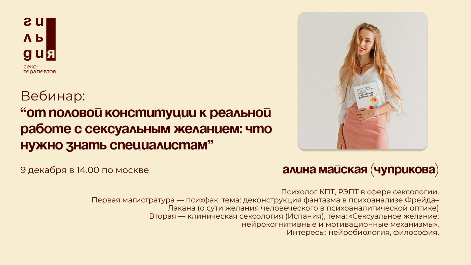 Спикер: Алина Майская (Чуприкова), психолог КПТ, РЭПТ в сфере сексологии. Защитила первую магистерскую на психфаке по теме деконструкции фантазма в психоанализе Фрейда-Лакана (о сути желания человеческого в психоаналитической оптике), и вторую магистерскую на клинической сексологии в Испании по теме “сексуальное желание: нейрокогнитивные и мотивационные механизмы”. Сферы глубокого интереса: нейробиология, философия.